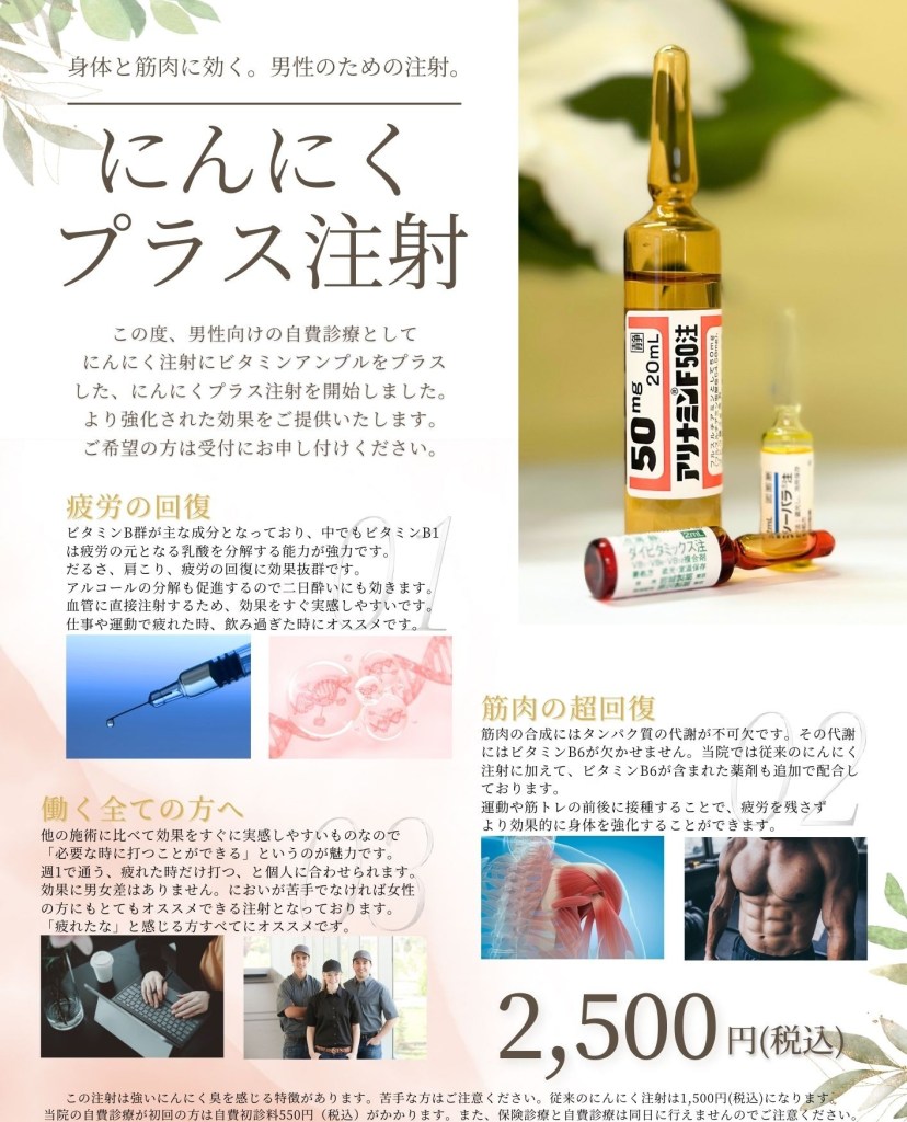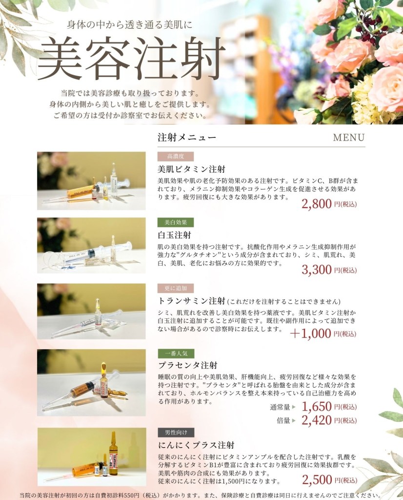 皮下注射です。初回投与時にメルスモン使用にあたっての同意書が必要となります。もともとは更年期症候群のためのお薬です。更年期症候群に該当する方は保険適用になります。詳細は「更年期症候群」のページをご覧ください。多くのアミノ酸を含んでいます。組織呼吸促進作用、創傷治癒促進作用、抗疲労作用などがあると言われております。美肌にも効果があると言われています。2アンプルだと、2,420円(税込)です。ラエンネックはじめました。プラセンタに関しては、「プラセンタ」のページをご覧ください。